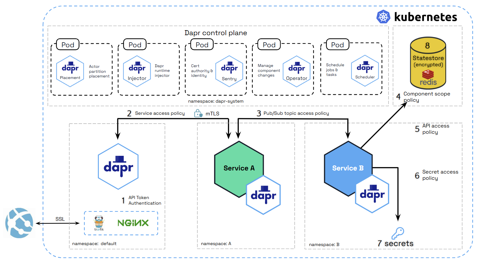 The diagram below shows a number of security capabilities placed in an example application hosted on Kubernetes. In the example, the Dapr control plane, the Redis state store, and each of the services have been deployed to their own namespaces. When deploying on Kubernetes, you can use regular Kubernetes RBAC to control access to management activities.