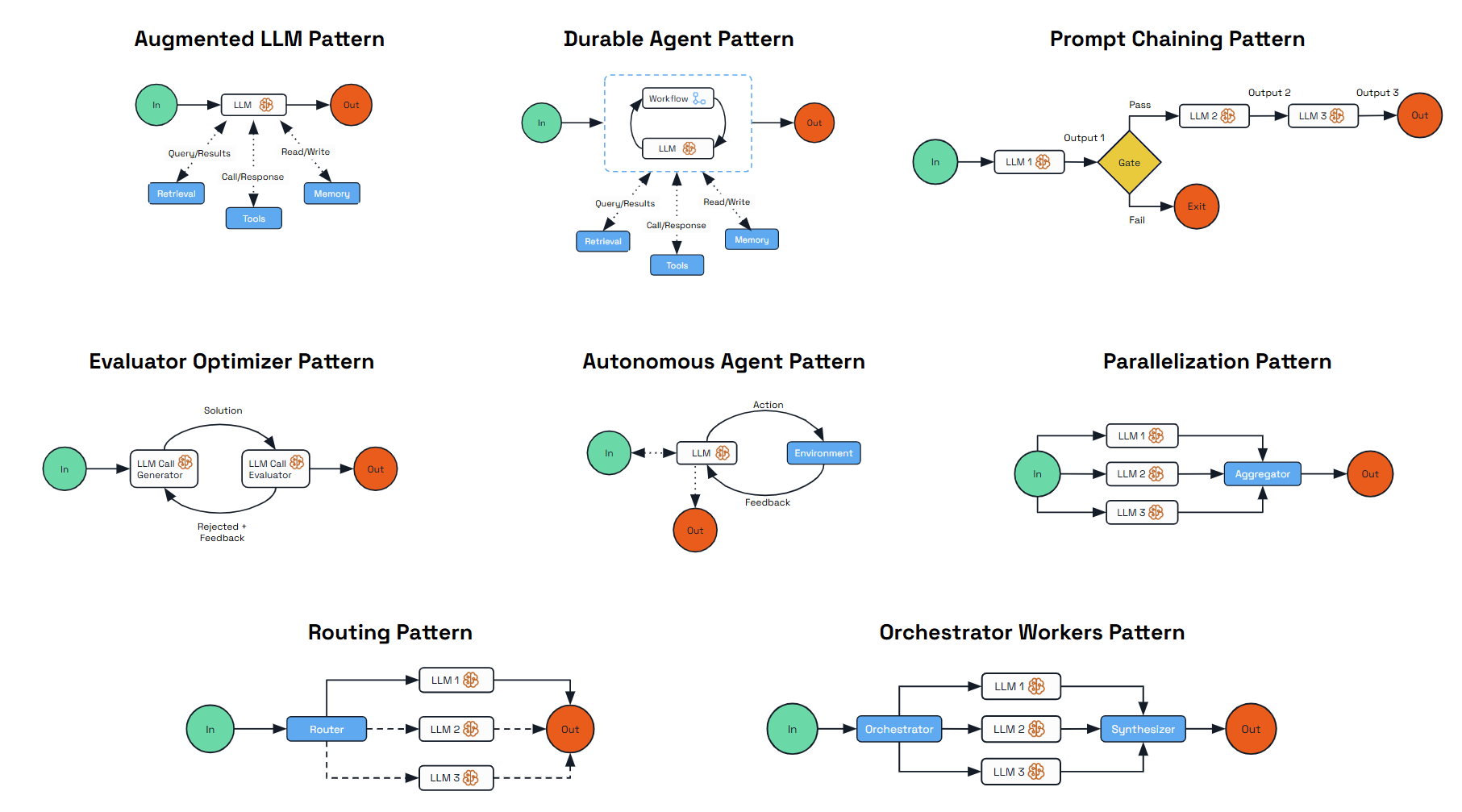| Durable Agent | Extends the Augmented LLM by adding durability and persistence to agent interactions using Dapr’s state stores. |