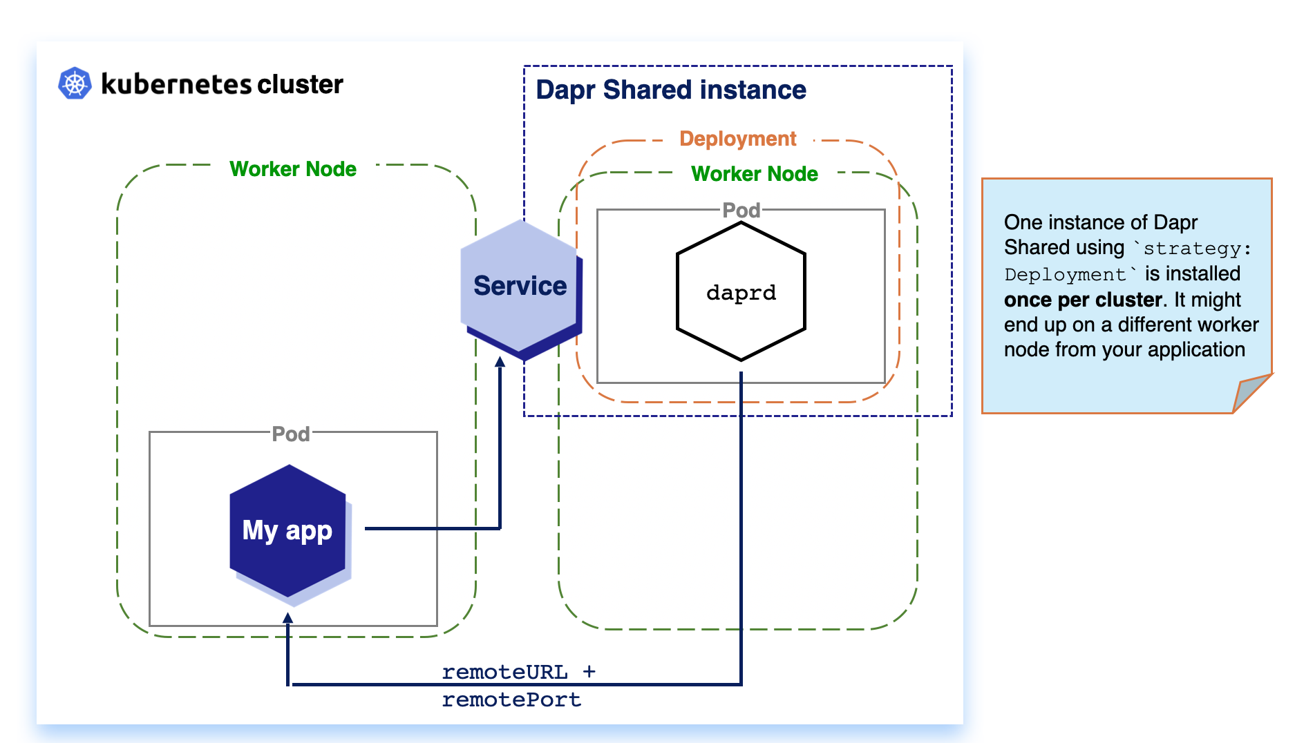 Kubernetes Deployments are installed once per cluster. Based on available resources, the Kubernetes Scheduler decides on which node the workload is scheduled. For Dapr Shared, this means that your workload and the Dapr instance might be located on separate nodes, which can introduce considerable network latency with the trade-off of reduce resource usage.